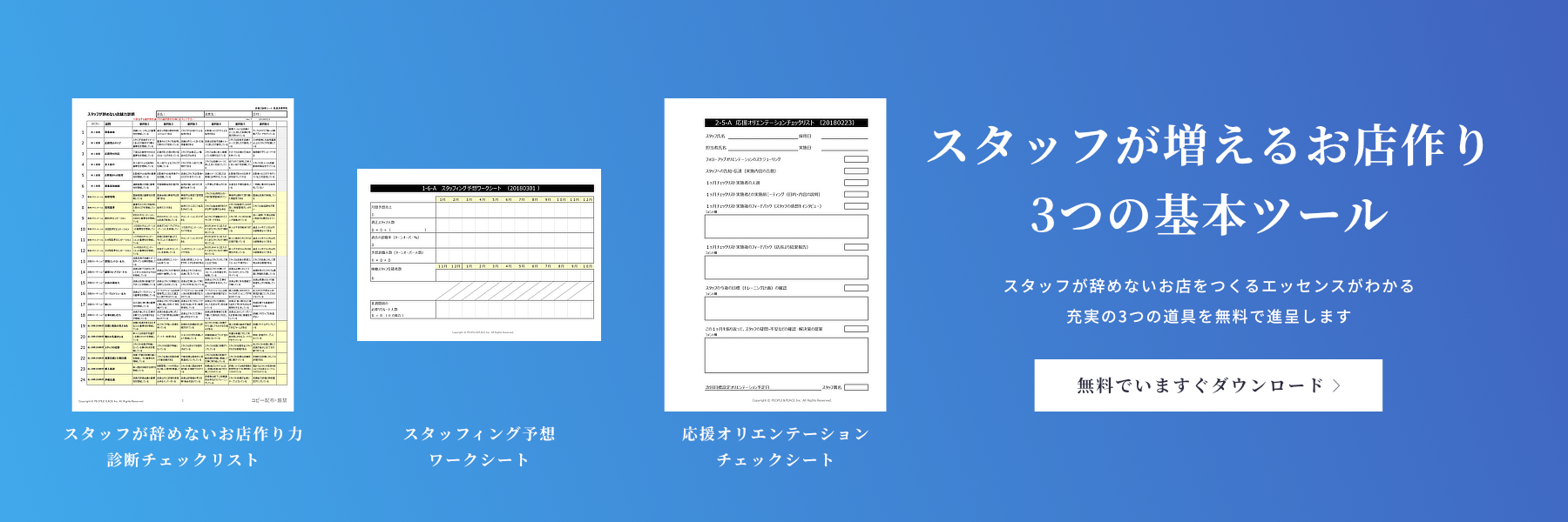スタッフが増えるお店をつくるエッセンスがわかる基本の3つのツールを無料で進呈します。